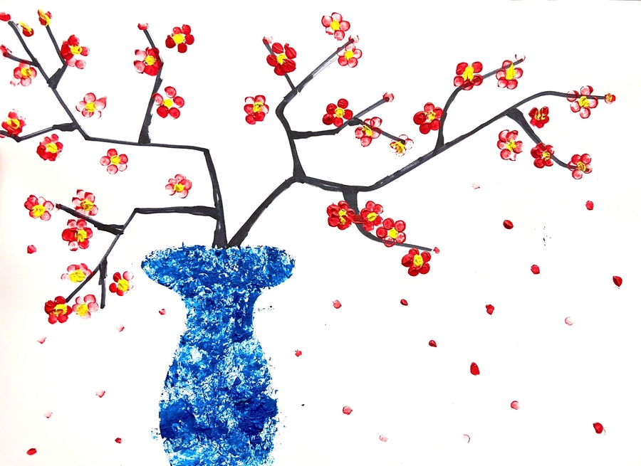 Dạy con khéoĐón Tết với tranh hoa đào vẽ từ tăm bông, giấy ăn