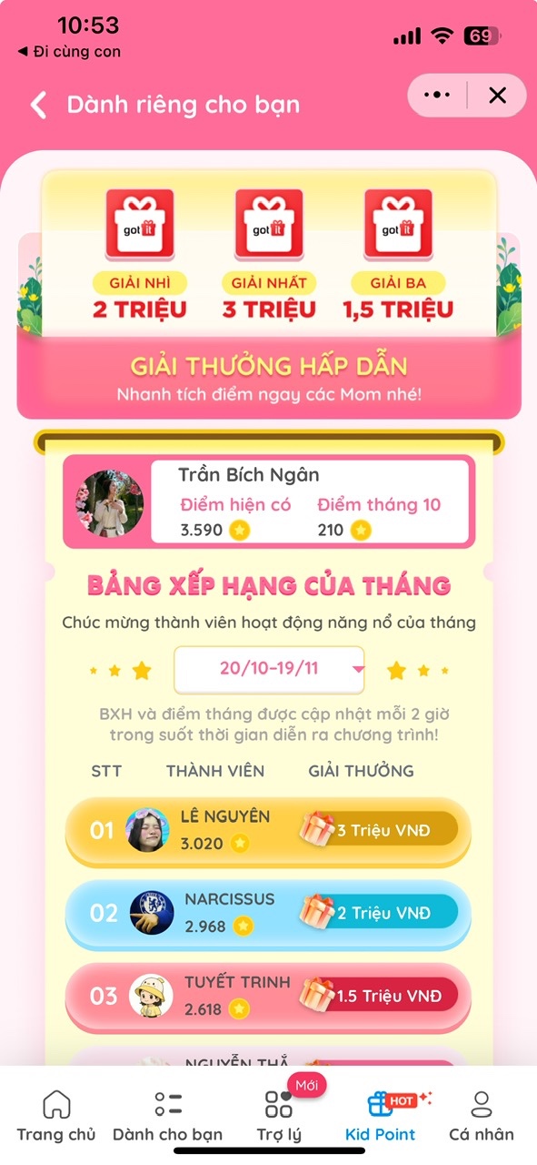 Thành viên có tổng Kid Point cao nhất trong tháng sẽ nhận quà theo thứ hạng.