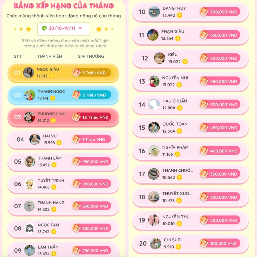 Tổng kết tháng này, vị trí dẫn đầu gọi tên Ngọc Giàu với 17.812 điểm - kết quả thể hiện sự kiên trì và bứt phá ở chặng cuối. Thành tích này giúp Ngọc Giàu nhận được voucher mua sắm trị giá 3 triệu đồng.