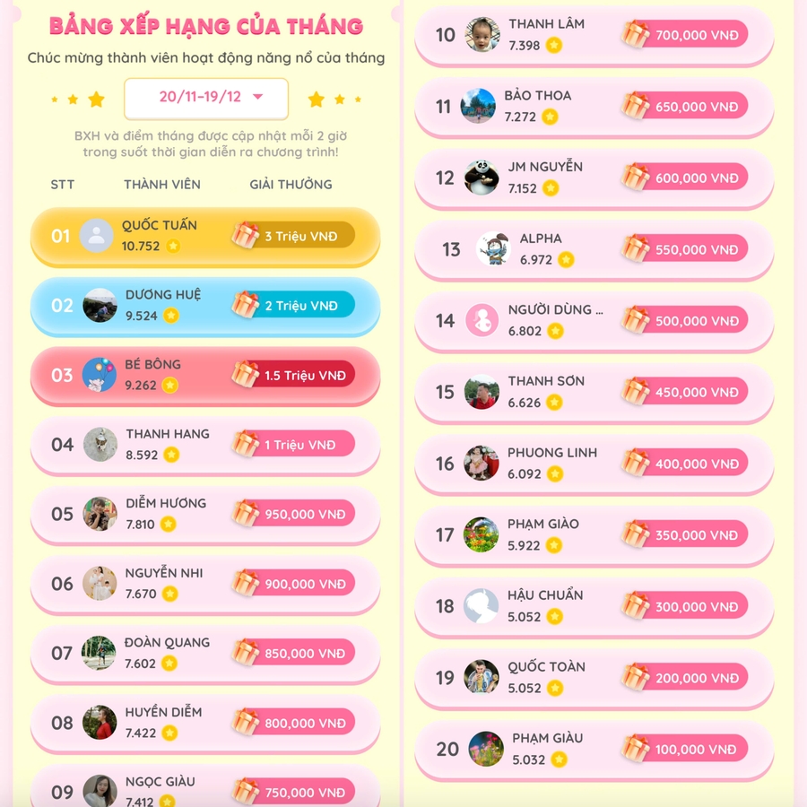 Đến lúc này, thành viên Quốc Tuấn tạm giữ vị trí dẫn đầu với 10.752 điểm, là ứng viên sáng giá của voucher 3 triệu đồng. Tiếp đến là Dương Huệ với 9.524 điểm và đuổi theo sít sao là Bé Bông với 9.262 điểm. Chỉ cần một ngày “leo điểm” mạnh, cục diện top 3 hoàn toàn có thể thay đổi. Các thành viên đang thuộc top đầu đừng quên rằng bất kỳ nhiệm vụ nào cũng là cơ hội quyết định thứ hạng.