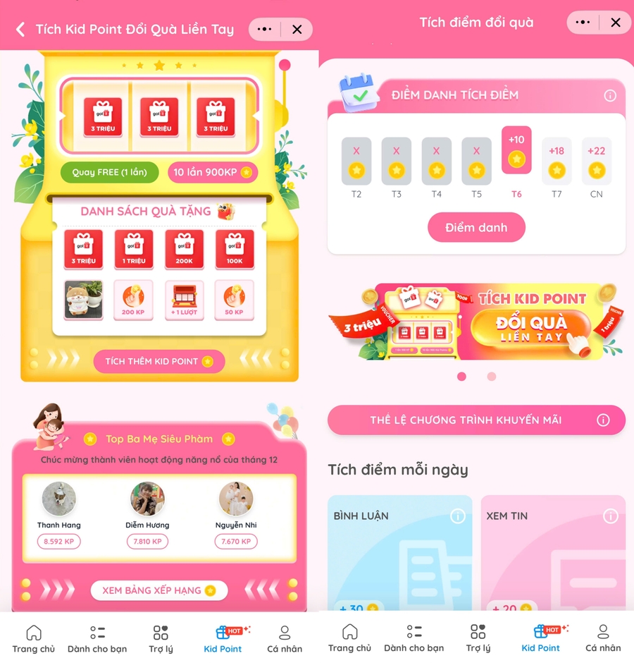 Ngoài top 20, rất nhiều thành viên khác cũng âm thầm tăng điểm, giữ tinh thần “bền bỉ mới bứt phá”. Miniapp Đi Cùng Con thiết kế hệ thống nhiệm vụ dễ làm và quen thuộc như điểm danh hàng ngày, xem tin, bình luận, đọc bài, tương tác nội dung trong cộng đồng… Mỗi nhiệm vụ chỉ mất vài giây nhưng mang về lượng Kid Point đáng kể, giúp người chơi tiến gần đến cơ hội nhận nhiều phần thưởng giá trị như voucher 3 triệu đồng, 1 triệu đồng, 200.000 đồng, 100.000 đồng hoặc thêm lượt quay trúng quà và Kid Point thưởng.