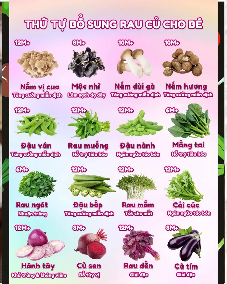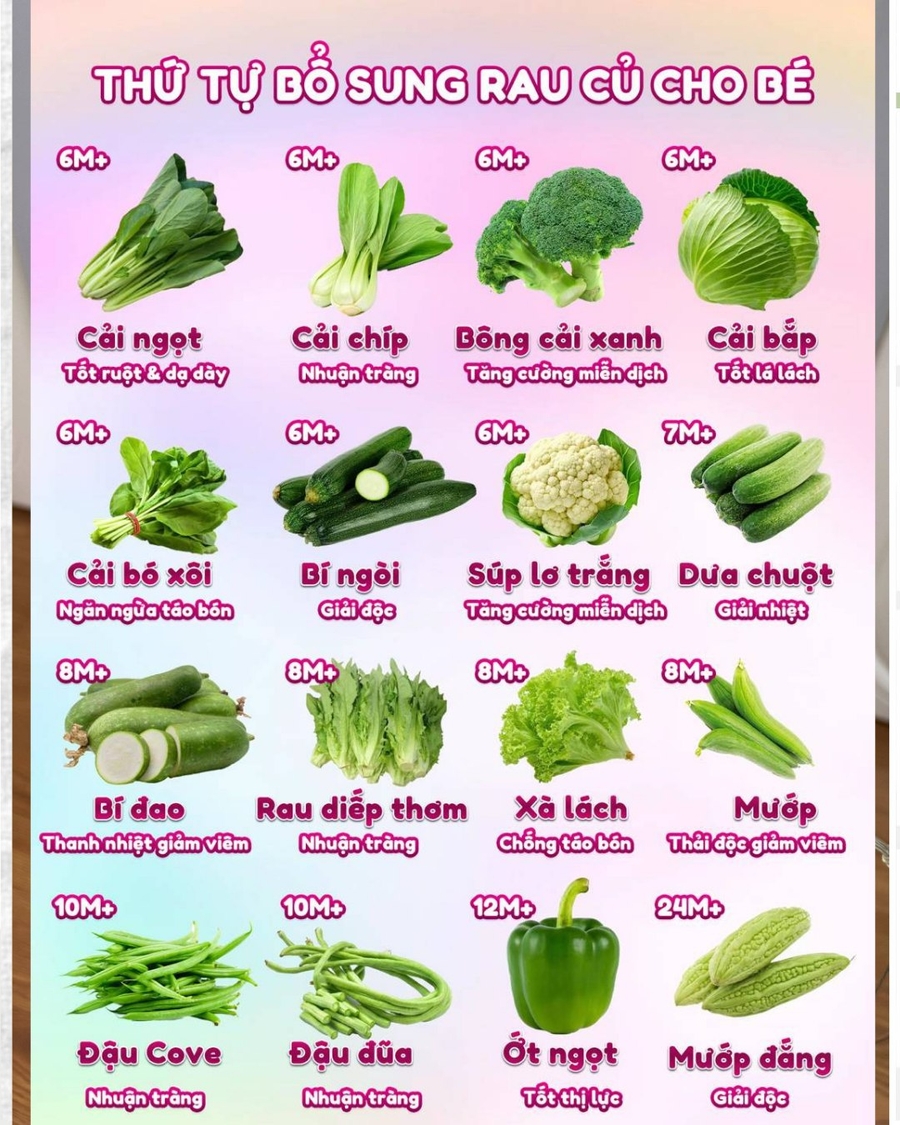 Mình biết nhiều mẹ mới cho con ăn dặm hay bối rối không biết nên cho bé làm quen rau củ theo thứ tự nào. Dưới đây là bảng mình tổng hợp theo tháng tuổi, giúp mẹ đỡ bỡ ngỡ hơn nhé!