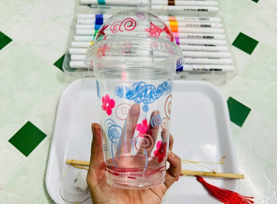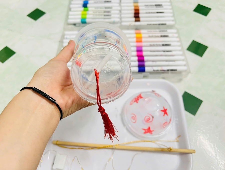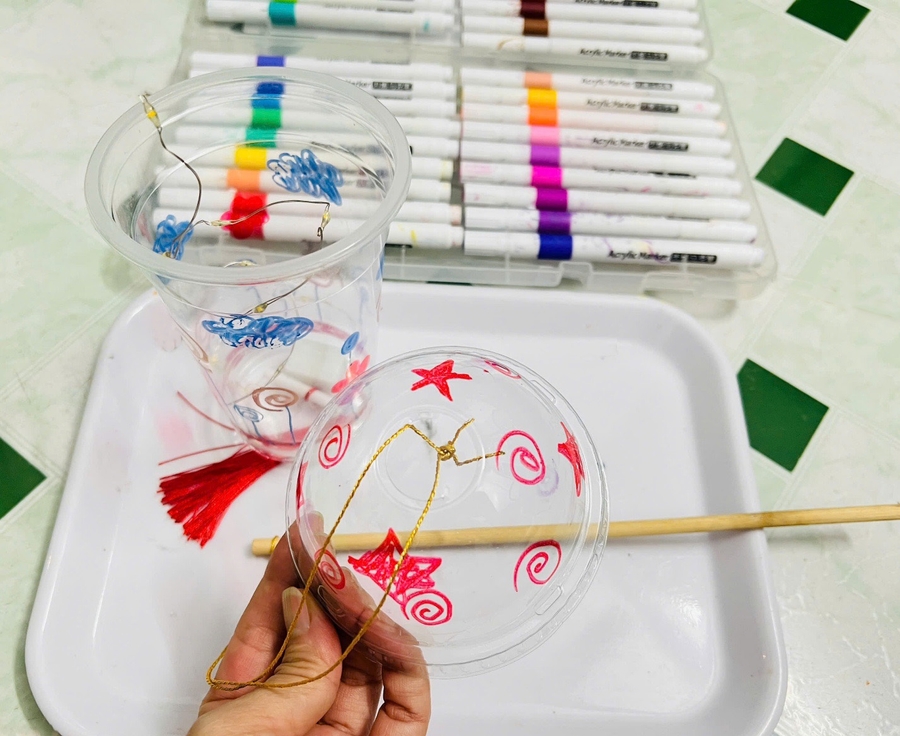 Sau khi luồn xong dây tua rua dưới đáy đèn lồng, cha mẹ tiếp tục hướng dẫn trẻ thả đèn đom đóm vào bên trong lòng cốc như hình trên.