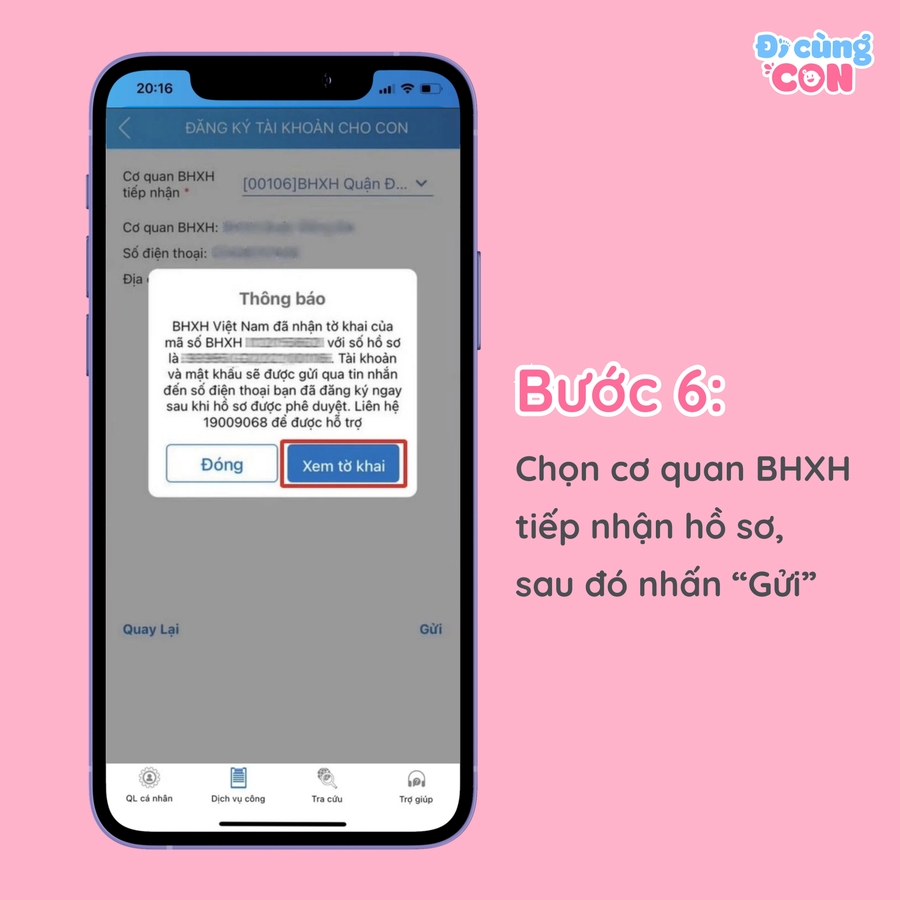 Sau khi gửi hồ sơ thành công, VssID sẽ hiển thị thông báo và gửi tin nhắn SMS đến số điện thoại của phụ huynh kèm đường link tải tờ khai. Đồng thời, hệ thống cũng gửi tờ khai vào email cá nhân (nếu đã đăng ký email trong hồ sơ).