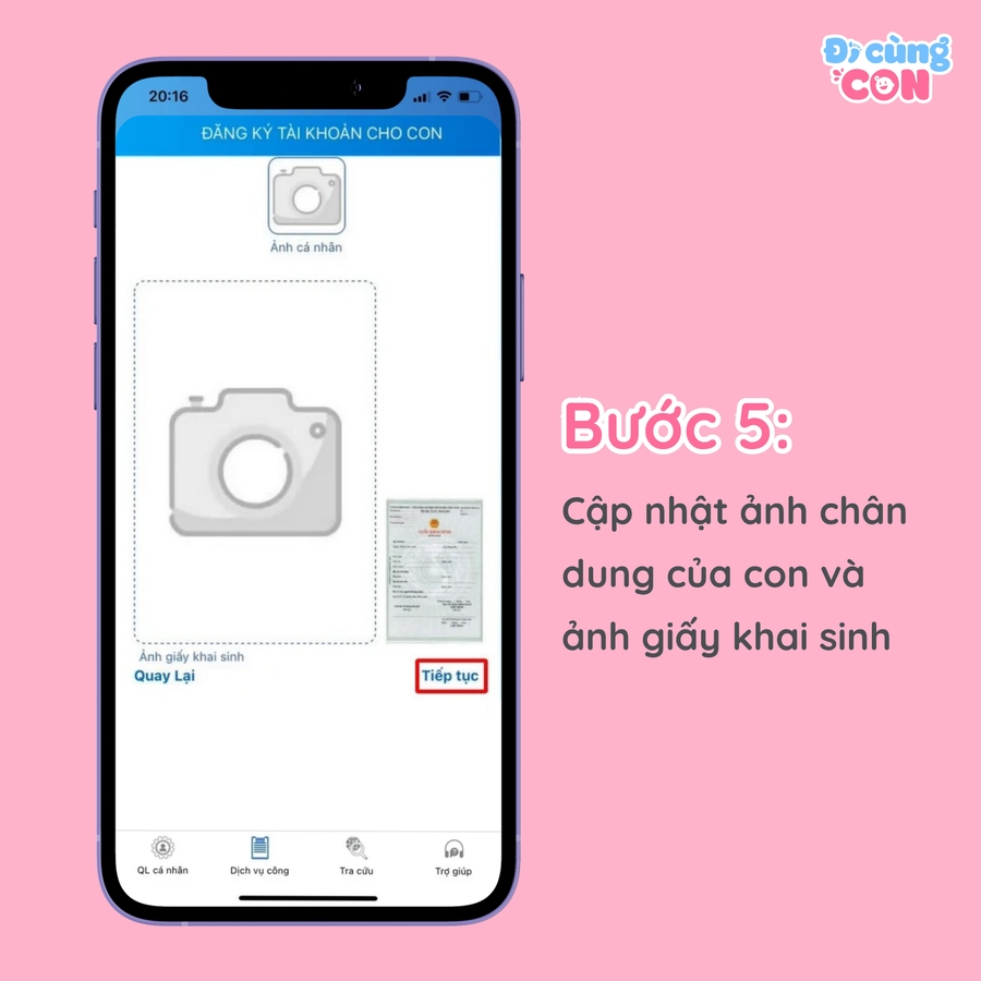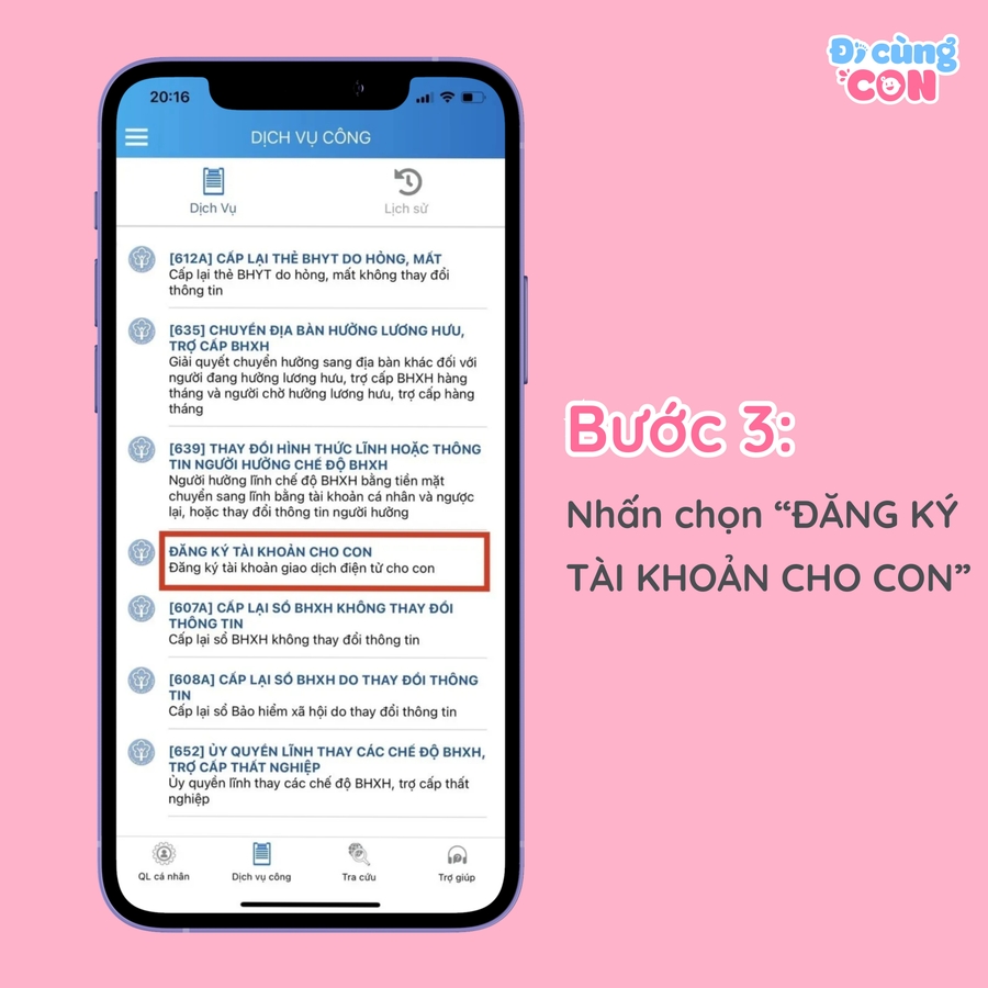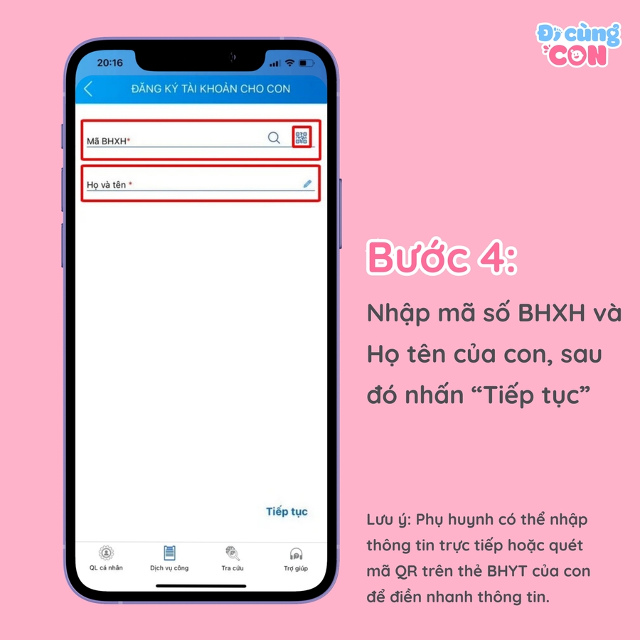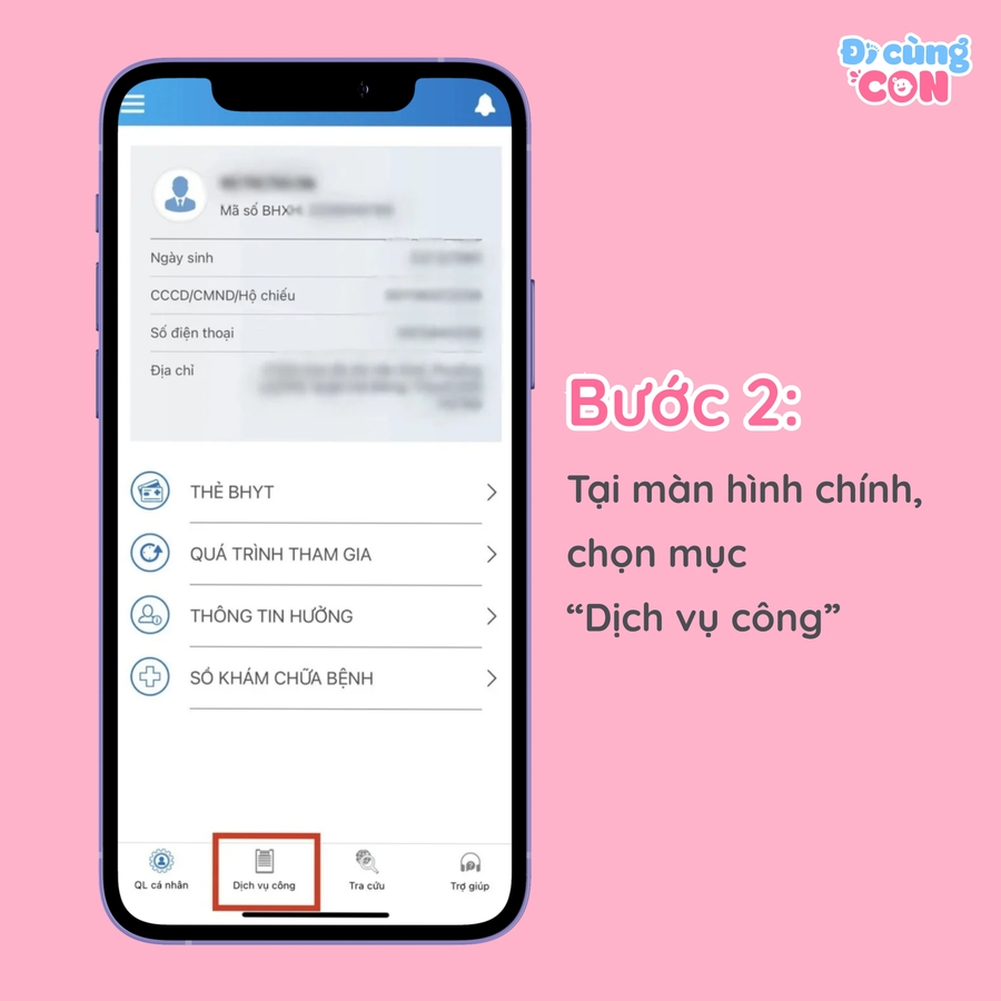 Việc tích hợp thẻ BHYT của con vào ứng dụng giúp cha mẹ tra cứu thông tin nhanh chóng và thuận tiện. Đi Cùng Con hướng dẫn cha mẹ cách thao tác đơn giản như sau.