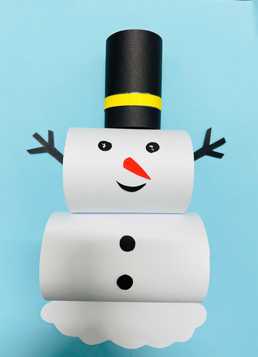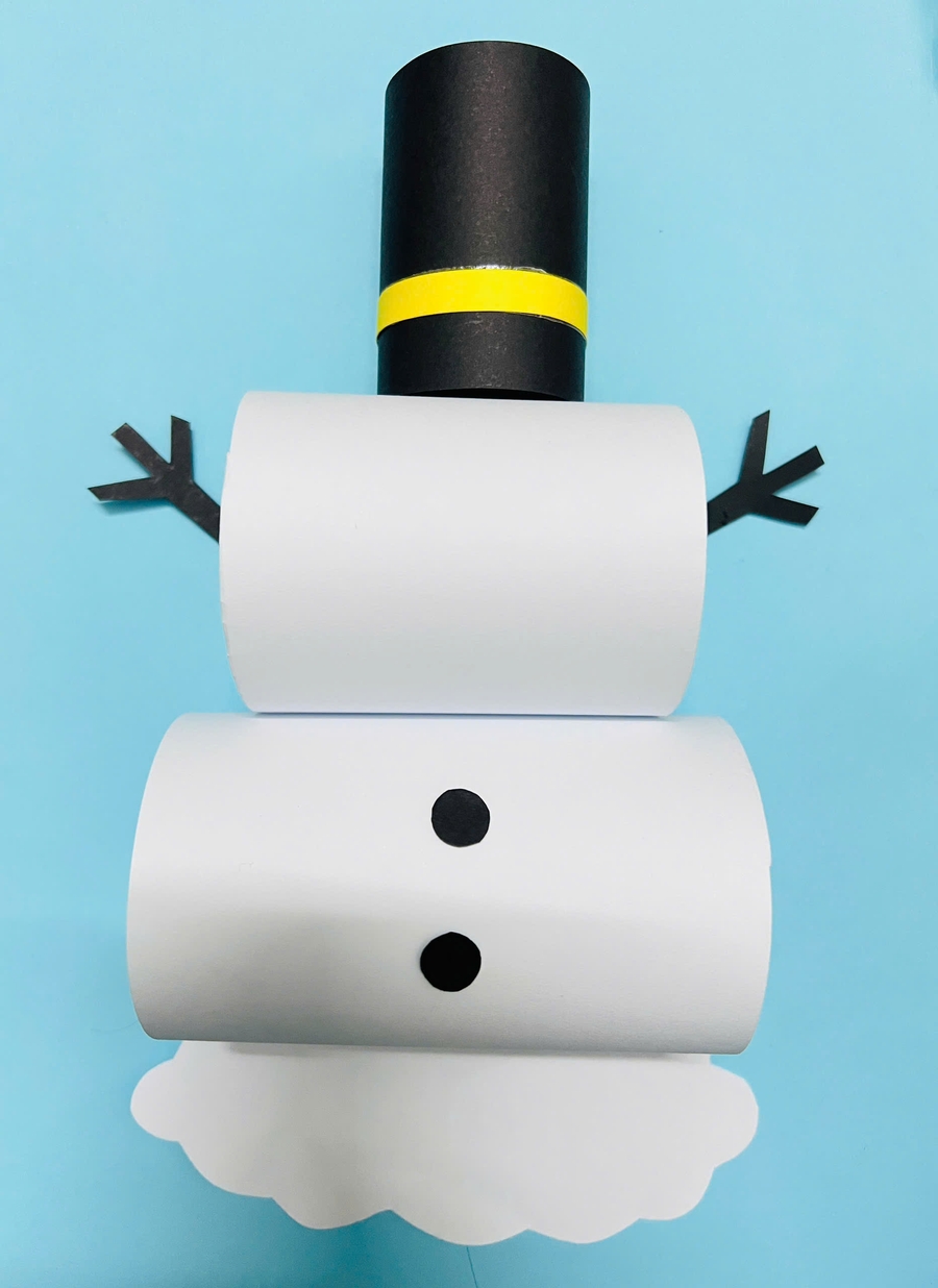 Cha mẹ hướng dẫn bé dùng băng dính 2 mặt hoặc hồ để dán phần thân và đầu của người tuyết lên bìa màu xanh như hình trên. Lưu ý: Hướng dẫn các bé dán cuộn giấy dài hơn ở dưới để làm thân người tuyết, cuộn giấy ngắn hơn phía trên để làm đầu người tuyết. Khi dán thì phải dán sát phần thân và đầu lại với nhau, căn chỉnh sao cho phần đầu cân giữa với phần thân nhé!
