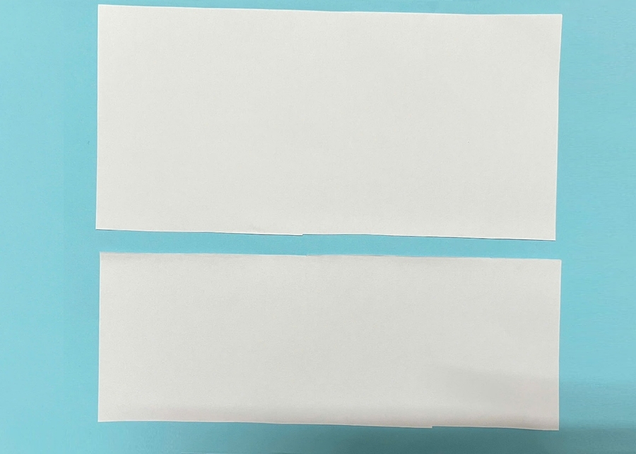 Sau khi đã chọn được giấy màu rồi, cha mẹ hướng dẫn các bé cắt giấy 2 phần hình chữ nhật dài như hình trên nhé. Lưu ý: 2 băng giấy màu trắng có kích thước chiều rộng khác nhau khoảng từ 6cm đến 10 cm, 1 băng rộng hơn để làm thân người tuyết và băng hẹp hơn để làm đầu người tuyết. Chiều dài khoảng từ 15cm đến 20cm.