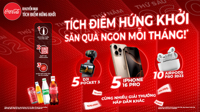 5 iPhone, 5 DJI Pocket, 10 AirPods & nghìn quà mua sắm mỗi tháng. Tích điểm siêu dễ, nhận quà siêu mê khi mua từ 4 lon Coca-Cola.